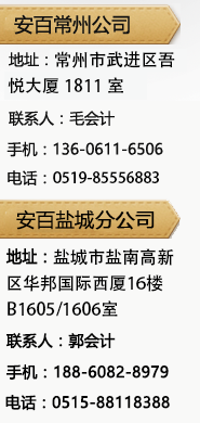 常州安百會(huì)計(jì)服務(wù)有限公司是經(jīng)常州市工商行政管理局批準(zhǔn)成立,多年來(lái)一直從事代理公司注冊(cè)和代理記賬,有著豐富的經(jīng)驗(yàn)和嚴(yán)格的公司制度和流程,專(zhuān)業(yè)辦理工商注冊(cè)及代理記賬的相關(guān)業(yè)務(wù)的代理機(jī)構(gòu),我公司擁有一批資深的具有會(huì)計(jì)中級(jí)職稱(chēng)的專(zhuān)業(yè)代理人員,熟悉相關(guān)法律,精通財(cái)務(wù)工作,與政府主管部門(mén)和相關(guān)社會(huì)機(jī)構(gòu)的長(zhǎng)期合作關(guān)系融洽,有良好的代理平臺(tái)。注冊(cè)公司類(lèi)型: 貿(mào)易公司、咨詢(xún)服務(wù)公司、裝飾公司、廣告公司、建筑工程公司、房產(chǎn)公司、科技公司、投資公司...